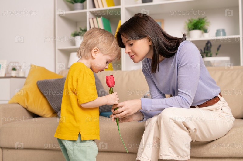 Красивая молодая женщина показывает красный тюльпан своему маленькому сыну, сидя на диване