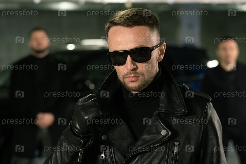 Мужской шпион или гангстер в солнцезащитных очках, черных кожаных перчатках и куртке