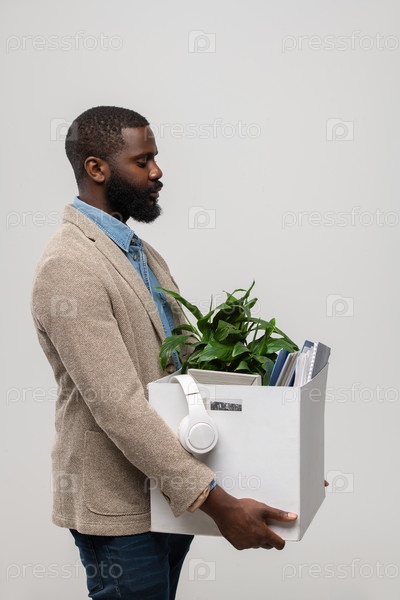 Молодой офисный работник держит коробку с наушниками, зеленым растением и другими принадлежностями