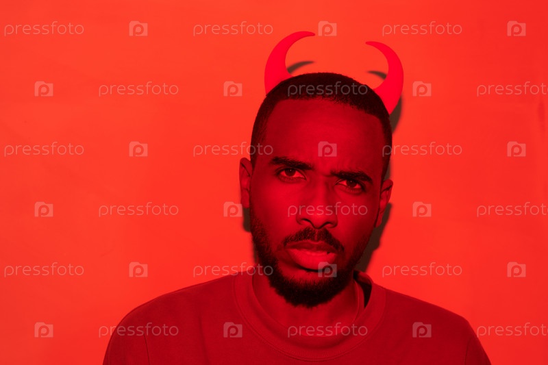Портрет мрачного, озадаченного молодого афроамериканца в дьявольских рогах с головным повязкой, стоящего в красной комнате, концепция Хэллоуина