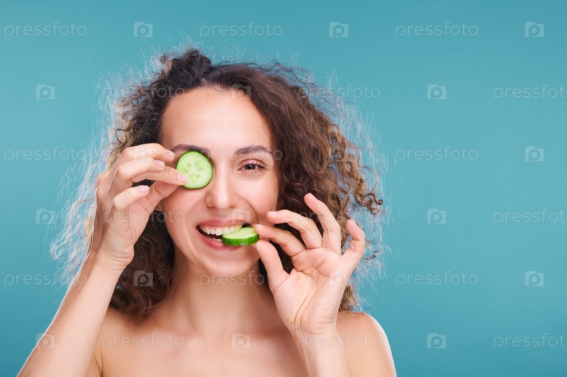 Красивая женщина смотрит на тебя, держа кусочек свежего огурца в одном глазу