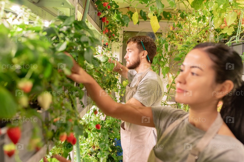 Молодой садовник в фартуке и повседневной одежде, заботящийся о клубнике