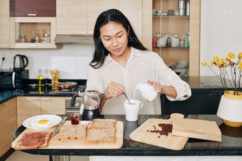 Женщина добавляет молоко в кофе