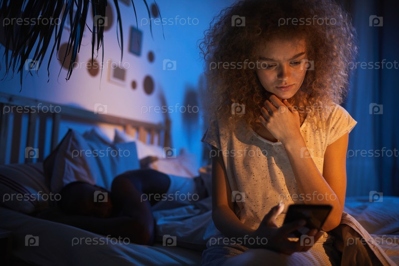 Молодая женщина читает текстовые сообщения ночью