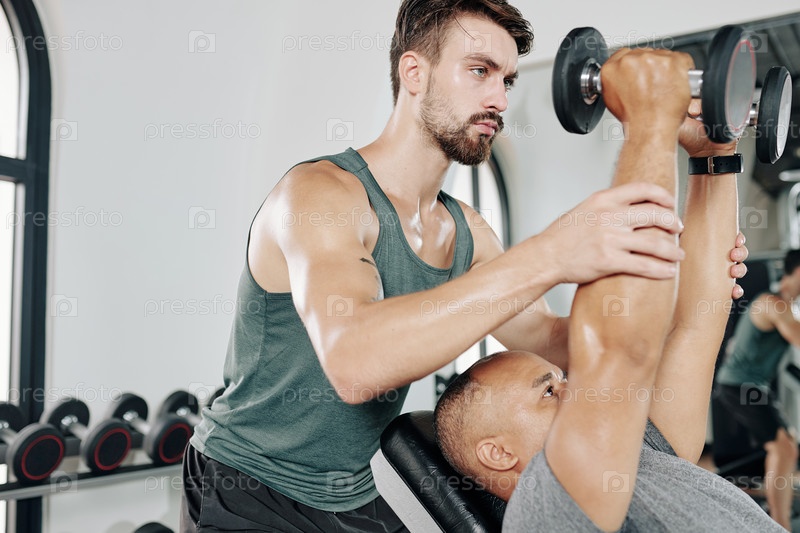 Фитнес-тренировщик помогает клиенту