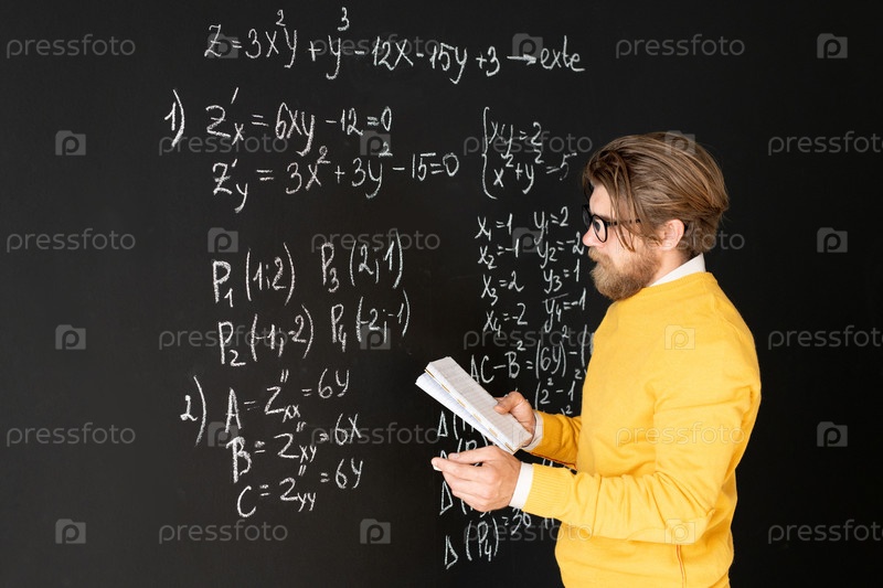 Бородатый учитель в повседневной одежде переписывает формулы на доске из своей книжки