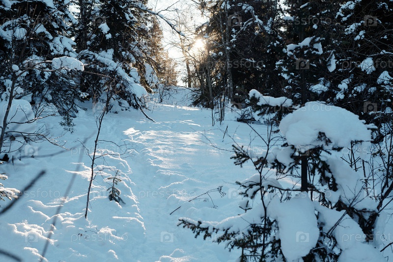 Величественный пейзаж покрытых снегом деревьев, окружающих дорогу в лесу