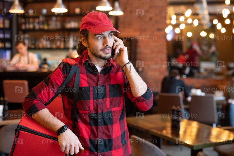Загруженный курьер в рабочей одежде разговаривает с одним из клиентов по мобильному телефону