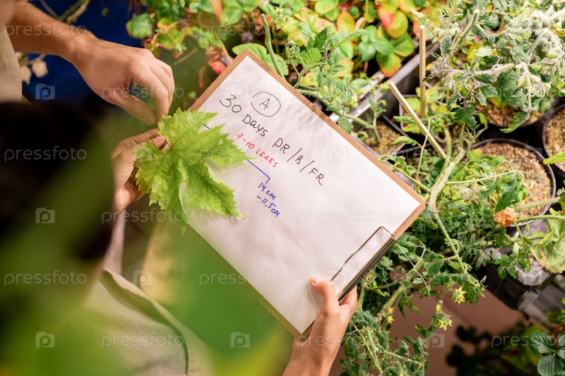 Руки современных фермеров или селекционистов, стоящих при выращивании томатного куста