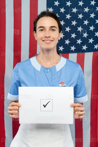 Молодая современная улыбающаяся горничная в форме показывает вам свой бюллетень
