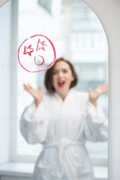 Молодая женщина кричит перед зеркалом с шокированным лицом, нарисованным помадой