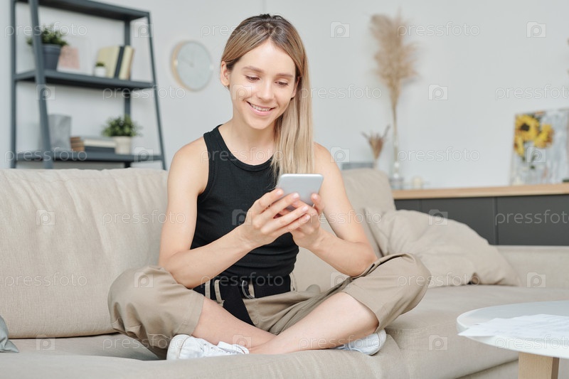 Счастливая молодая женщина в повседневной одежде, сидящая на диване со скрещенными ногами