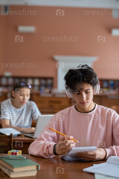 Серьезный студент колледжа в наушниках слушает музыку, читая свои заметки