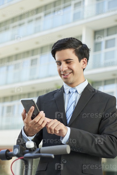 Улыбающийся предприниматель читает сообщение