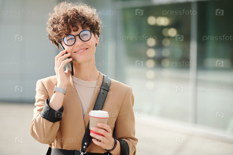 Счастливая молодая элегантная бизнесвумен с напитком, держащая смартфон ушами