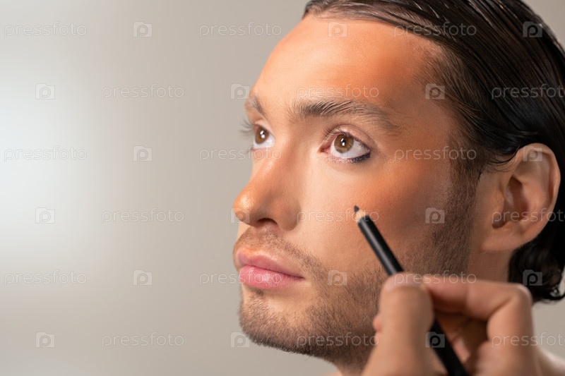 Рука молодого гримёра с черной подкладкой для глаз Kohl собирается нанести ее