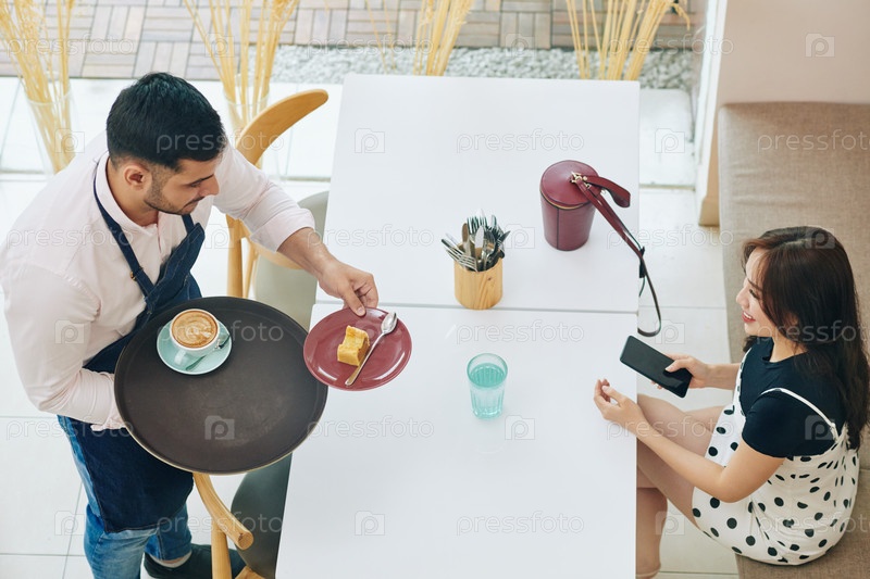 Официант приносит женщине торт и капучино