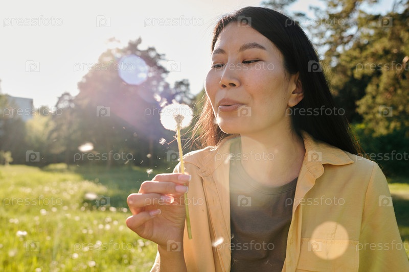 Счастливая молодая азиатская женщина в повседневной одежде дует на одуванчик в руке