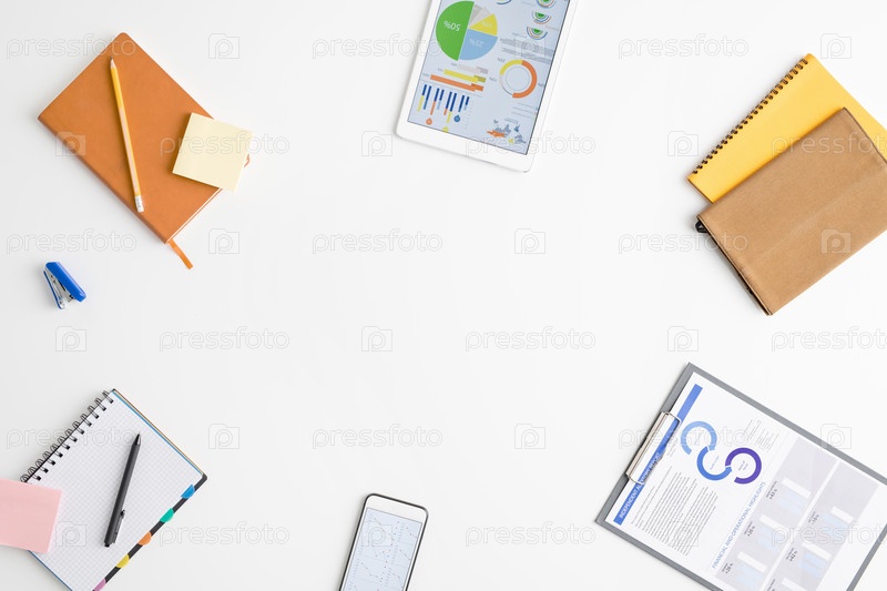 Верхний вид материалов офисного работника или брокера, окружающих copyspace для текста