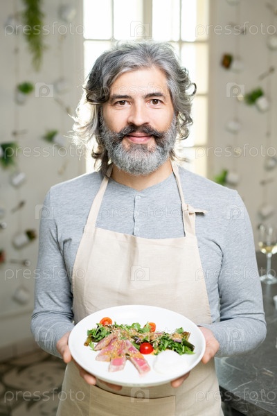Зрелый бородатый мужчина в пуловере и фартуке держит тарелку с овощным салатом