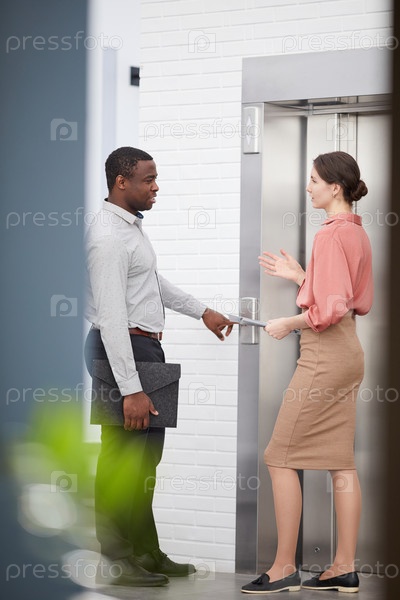 Мужчина и женщина, разговаривающие в лифте в офисе