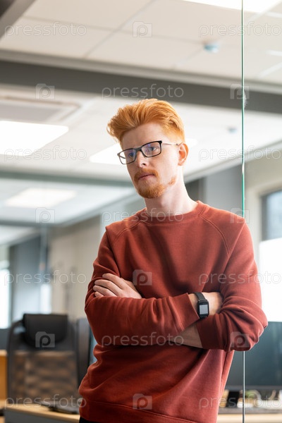 Молодой серьезный бизнесмен в коричневом пуловере, держа руки скрещенными к груди
