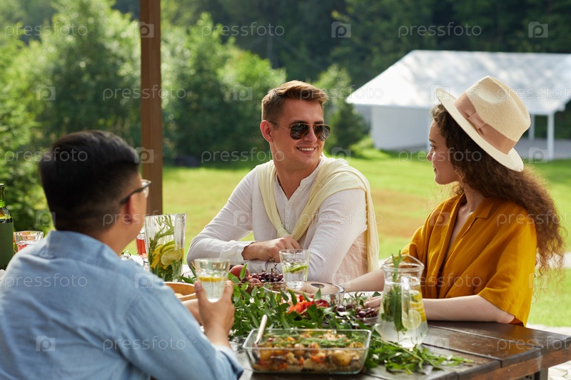 Пара обедает на свежем воздухе на летней вечеринке