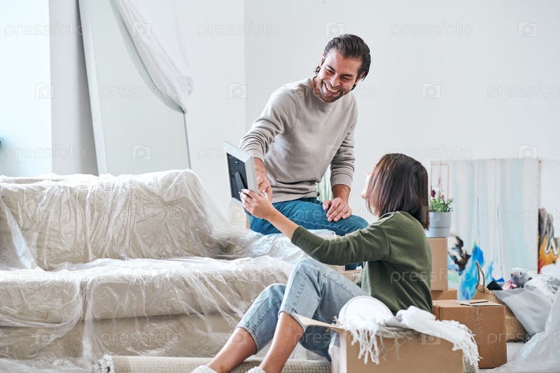 Молодая пара обсуждает картинку в кадре, а смеющийся мужчина указывает на нее