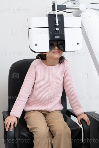 Ученица начальной школы в повседневной одежде проходит обследование зрения на клиниках