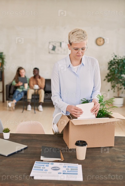 Депрессивная девушка с очками, стоящая за столом и упаковывающая вещи в картонную коробку после увольнения
