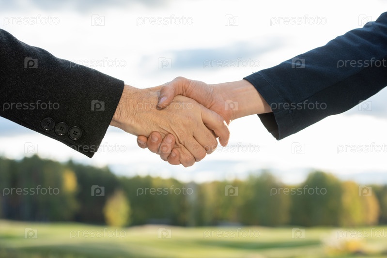 Пожимание рук двух современных успешных деловых партнеров против зеленых деревьев
