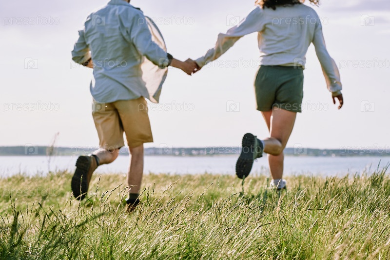 Задний вид счастливой любовной молодой пары, бегущей к реке или озеру
