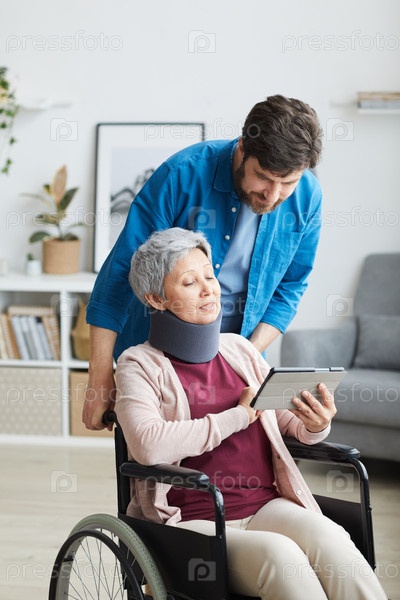Пожилая женщина-инвалид, использующая планшетный компьютер