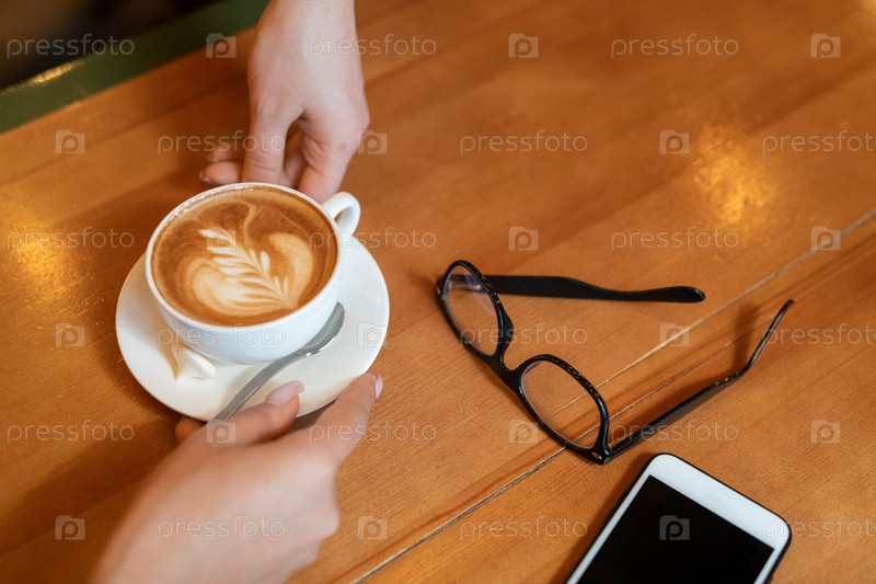 Рука молодой официантки кладет чашку ароматного капучино на деревянный стол