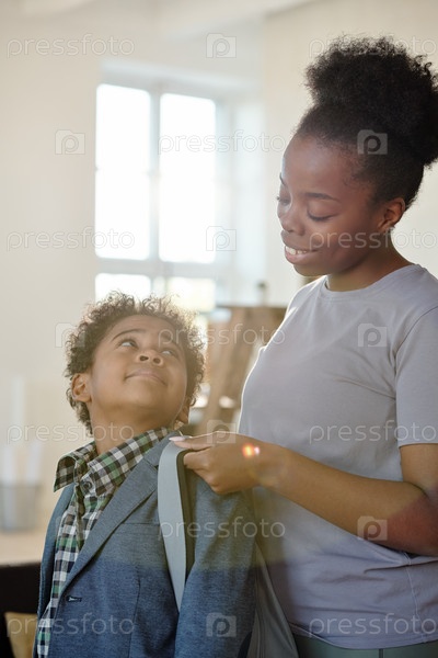 Счастливая молодая бережная мать в повседневной одежде помогает своему маленькому сыну с рюкзаком