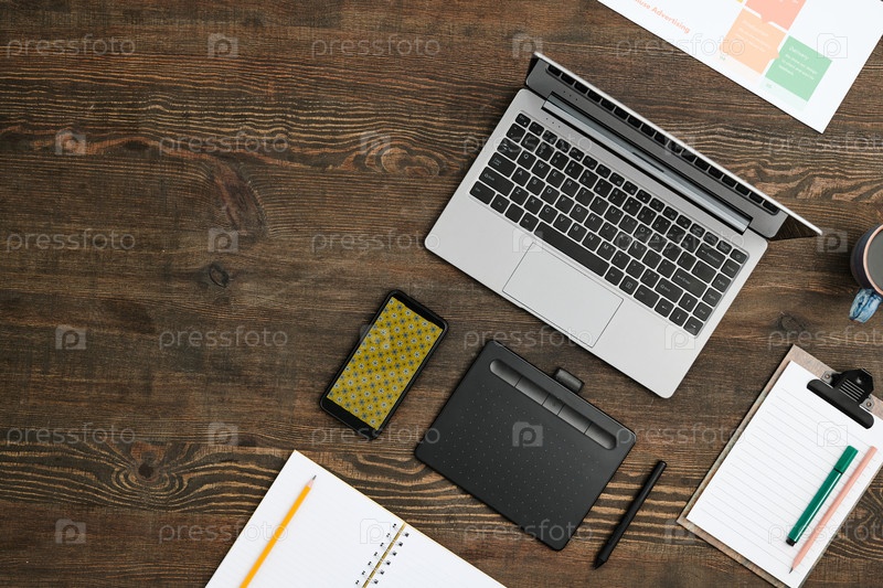 Плоская компоновка мобильных гаджетов, напитки, открытый блокнот с карандашом и другие вещи