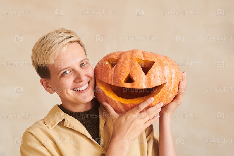 Портрет веселой хипстерской девушки с короткими светлыми волосами, позирующей со смешной вырезанной тыквой на изолированном фоне
