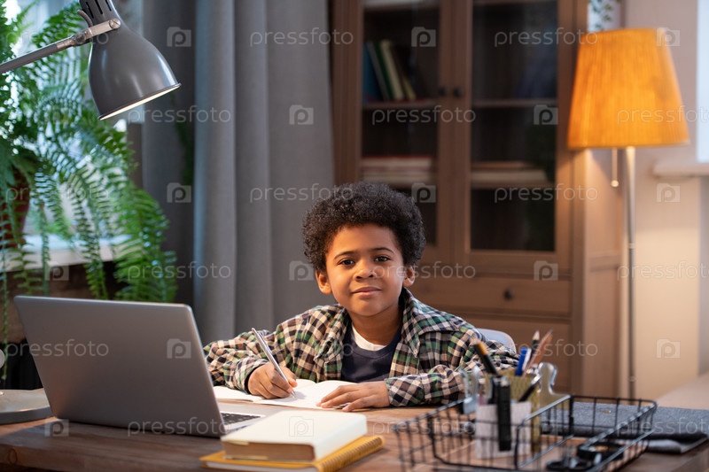 Умный и трудолюбивый африканский школьник, делающий заметки и смотрящий на тебя дома