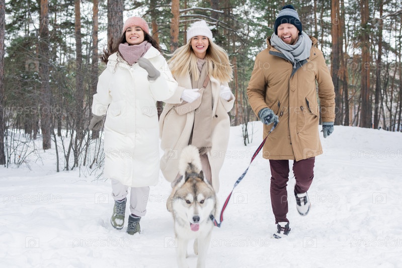 Веселые красивые девушки и молодой человек, бегущий по снегу за сибирским хаски