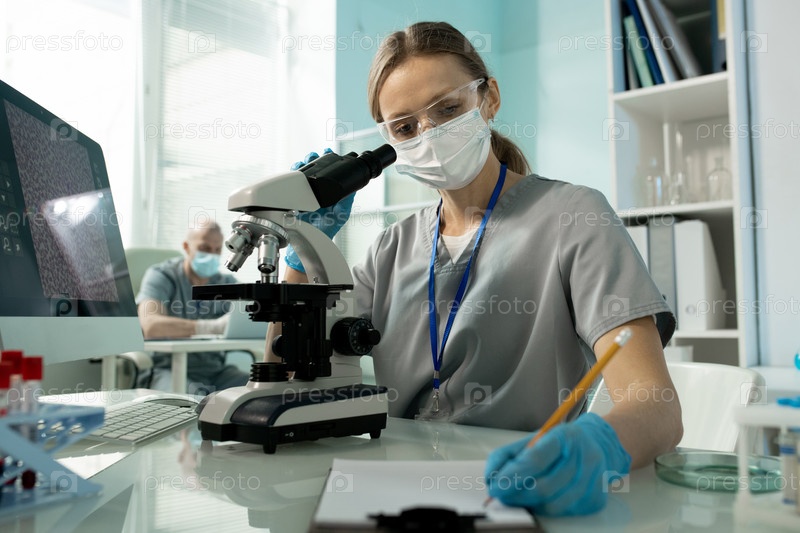 Работница лаборатории делает заметки в документе, работая с микроскопом