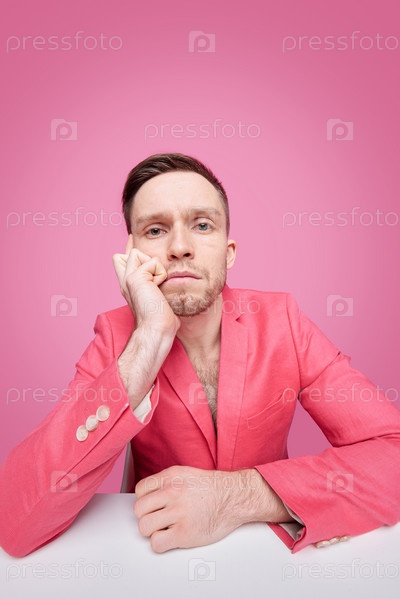 Печальный или скучный молодой человек в красной гламурной куртке над туловищем, сидящий за столом