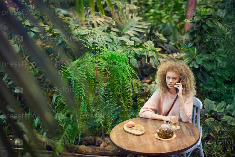 Женщина, разговаривающая по телефону в кафе