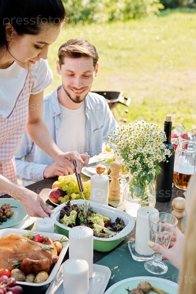 Красивая брюнетка берется за вегетарианский салат из контейнера, чтобы положить его на тарелку