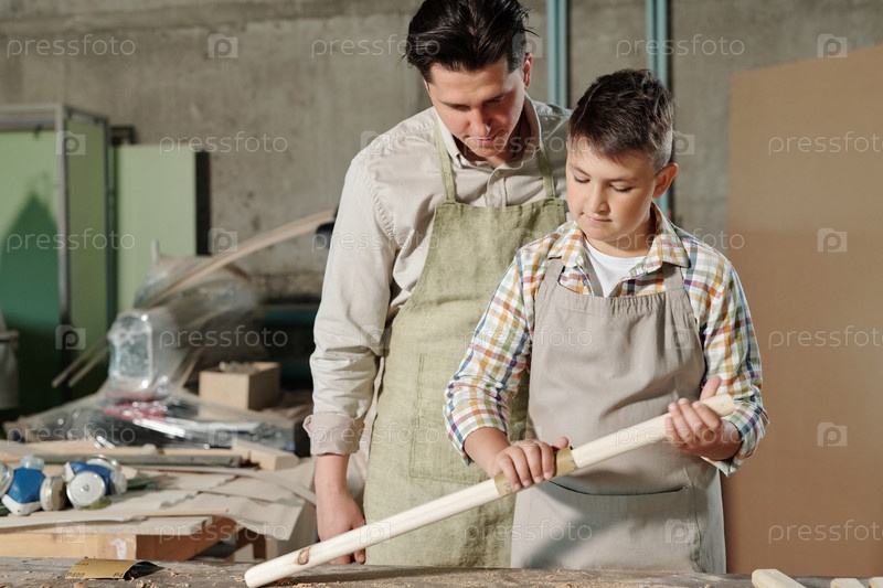 Отец контролирует, как сын работает с деревом