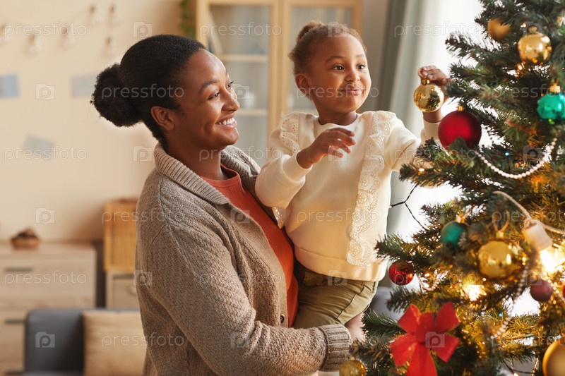 Мать и дочь украшают рождественскую елку