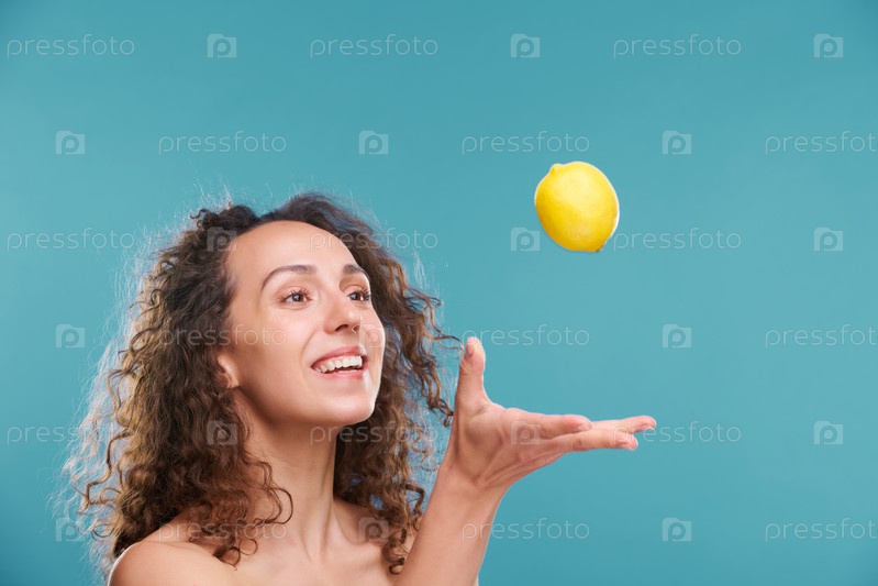 Молодая радостная женщина с зубчатой улыбкой и темными волнистыми волосами, бросающая свежий лимон