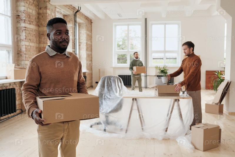 Группа молодых межнациональных сотрудников, несущих коробки для переезда в новом офисе во время создания нового пространства