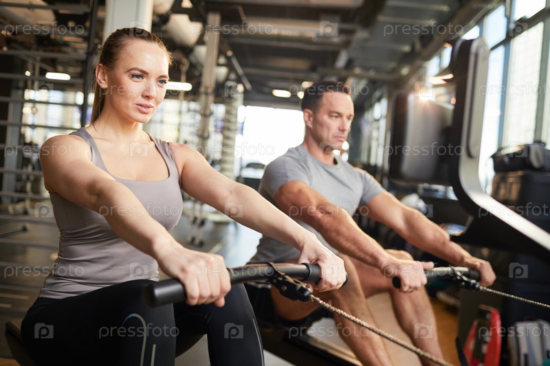 Пара, использующая упражнительную машину в тренажерном зале