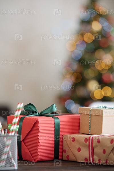 Группа упакованных рождественских подарков на столе перед камерой против елки