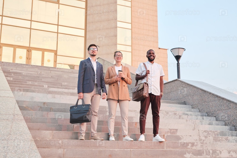 Группа молодых веселых деловых партнеров различных этнических групп, стоящих в очереди